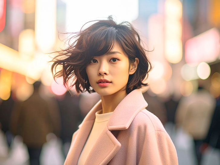- 都会の喧騒の中に静かにたたずむ女性のおしゃれな画像