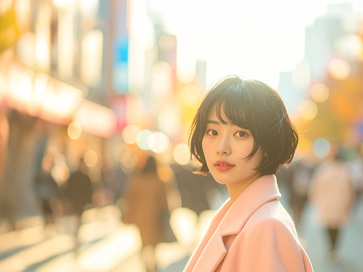 - 都会の喧騒の中に静かにたたずむ女性のおしゃれな画像